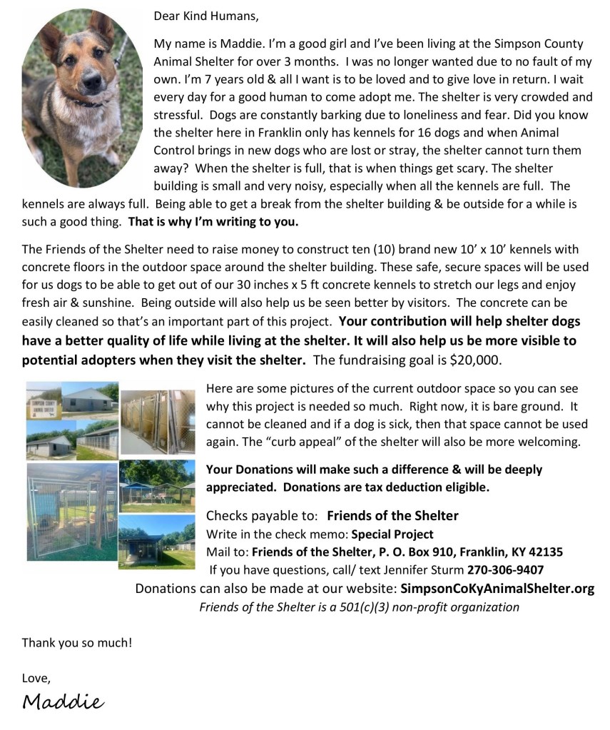 You can make a secure donation right here using your credit or debit card. You can also write a check payable to “Friends of the Shelter” & mail it to P.O. Box 910, Franklin, KY 42135 or drop it off at the shelter. Please note on the check: Special Project.